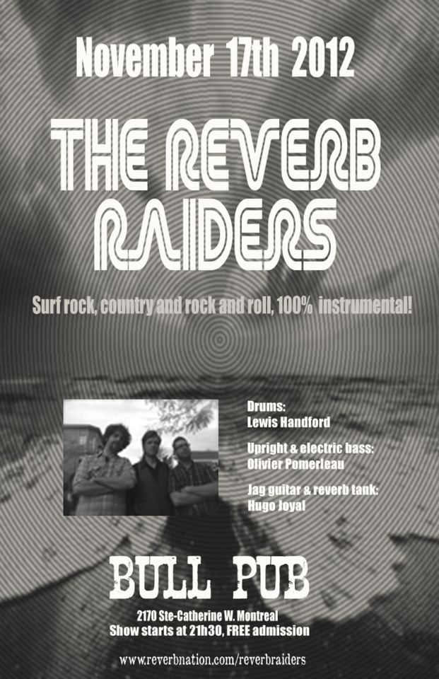 I have a few things to announce: I am part of a great little instrumental surf trio, going by the name The Reverb Raiders, with a couple great musicians from Montreal; Hugo Joyal(Jaguar guitar) and Olivier Pomerleau(upright and electric bass).